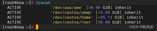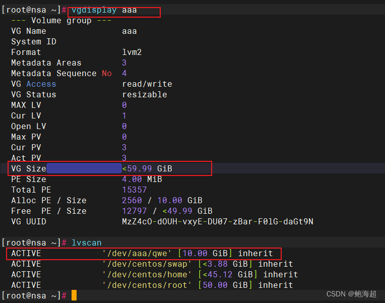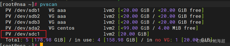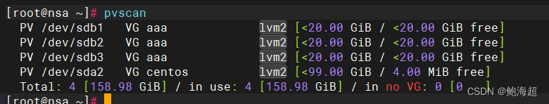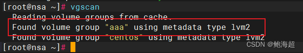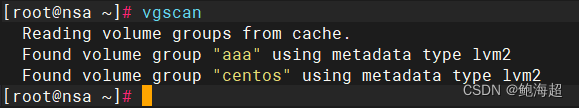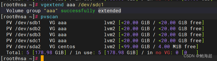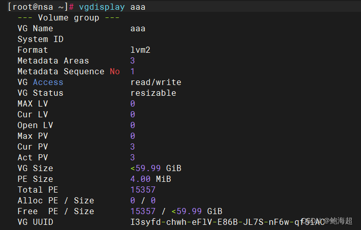 # 也可以将不通磁盘上的物理卷组成一个 如 vgcreate aaa /dev/sdb1 /dev/sdc2 /dev/sdd3