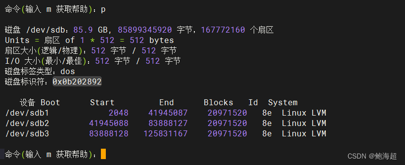 现在分好区了 但是他们只是普通的分区 再次使用 fdisk + 你要管理的磁盘