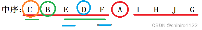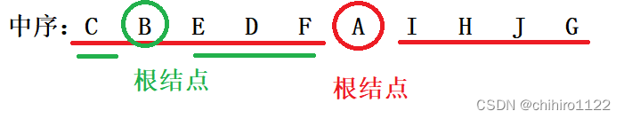 我们在中序当中,循环找出这个 B 这个根结点的 左右子树,如下图所示,用绿色横线表示: