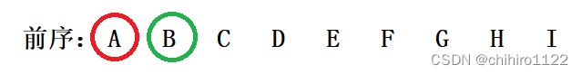 那么,每一次由根结点所分出来的左子树和右子树的结点,我们可以看做是两个区间,这两个区间就是每一次由根结点分割出来的左子树区间和右子树区间。比如,在左子树区间当中,因为前序的从左向右我们可以依次来找出 根结点。如上述,我们第一趟找出的是 A 这个结点是这个整个数的根节点,那么 B 就是这个 A 这个根结点的左子树的根结点,如下图所示: