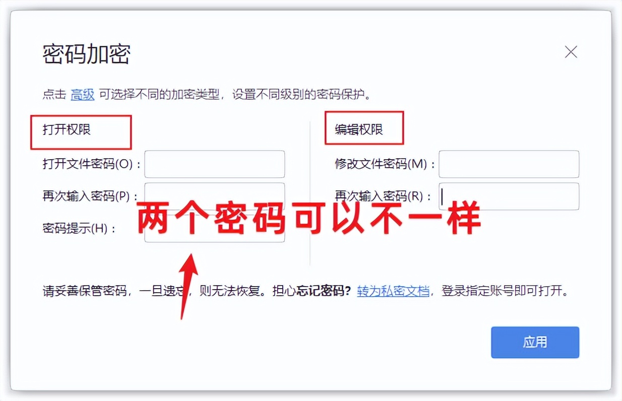 可以设置打开密码或编辑密码,可以只设置一个密码或者两个不同的密码。