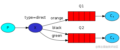 Ps:为什么 X 到 Q2 要有 black,green,2个 binding key呢,一个不就行了吗? - 这个主要是因为可能又有 Q3,而Q3只接受 black 的信息,而Q2不仅接受black 的信息,还接受 green 的信息。