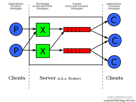 中间即是 RabbitMQ,其中包括了 交换机 和 队列。