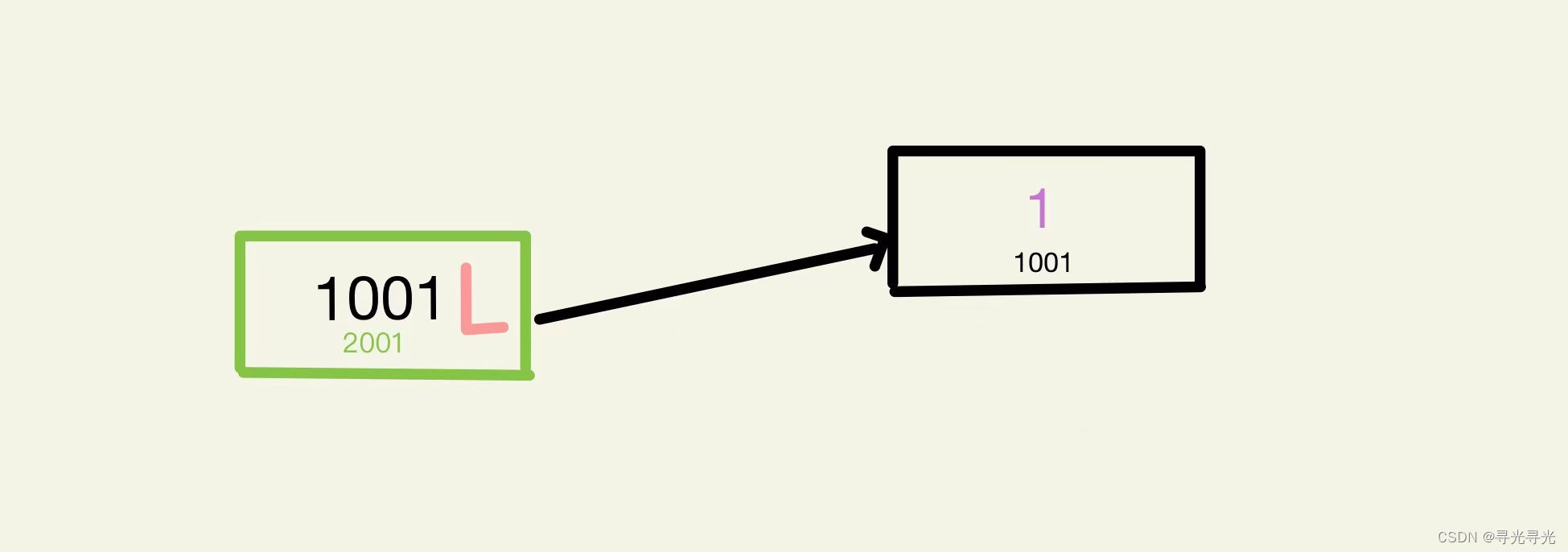 内存地址为1001存储着数值1,内存地址为1002存储着数值2.(这里内存地址只是为了方便而这样写,计算机的内存地址表示不一定这样)