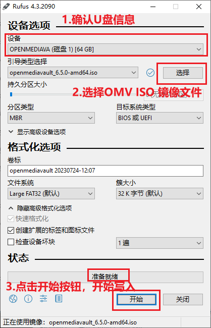 插入U盘后运行Rufus,正常情况我们可以在设备栏中查看到当前插入的U盘。此时点击引导类型右侧的选择按钮,选择刚才下载OMV ISO镜像文件。当看到状态栏为‘’准备就绪‘’时,就可以开始写入了。