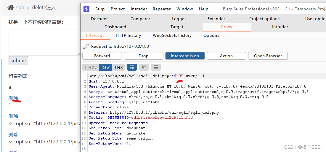 删除界面的注入,写一个留言,点击删除,并抓包。
