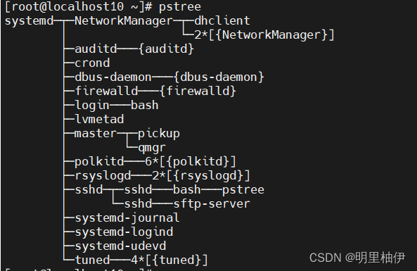 当一个进程调用 fork 函数生成另一个进程,原进程就称为父进程,新生成的进程 则称为子进程。 Linux 系统中这样父子进程非常多,我们可以使用 pstree 命令查看系统上的进程 「谱系」。