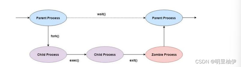 通常情况下,子进程退出后,它立即从内存中移除,但进程描述符仍然保留在内存中 (进程描述符占有极少的内存空间)。子进程的状态变成EXIT_ZOMBIE,并且向父 进程发送SIGCHLD(-17)信号,父进程会使用 wait 或 waitpid 函数进行回收子 进程的资源,并获得子进程的终止状态。在wait()调用之后,僵尸进程就完全从内存 中移除了。因此一个僵尸进程存在于其终止到父进程调用wait()函数。
