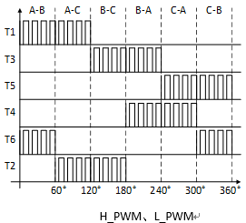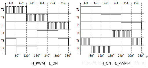 两类,一类是六个导通状态始终只对上桥臂或只对下桥臂的功率管进行PWM调制,这种方式下有一个桥臂的功率管始终在它应该导通的区间内处于全通状态,包括两种方式:H-PWM_L-ON方式和H-ON_L-PWM方式,见图3;另一类是使所有的功率管在导通的区间内轮换导通,包括两种方式:PWM-ON方式和ON-PWM方式,见图4。