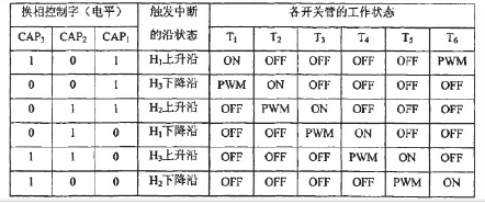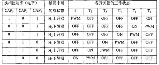 当位置传感器产生上升沿中断时,系统进入中断服务子程序。通过将脉冲捕捉单元的脉冲捕捉口CAP1-CAP3设置为普通I/O口,并检测这三个口的电平状态,就可以确定是电机的那个位置传感器的电平发生变化,从而确定出电机转子磁极现在所处的位置,然后按照电机正转的相序查找数据表来确定电机换向的顺序以及比较单元的控制字,从而实现电机正转时的正确换相。