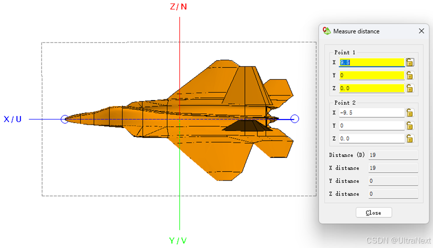 飞机目标模型尺寸如下如所示,可以看出目标两机翼之间的距离为13.6m,而机头到机尾的全长是19m。