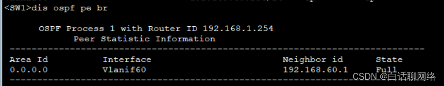 SW1设备为各vlan的终结设备,也就是需要起三层vlanif接口来识别并剥离vlan标记,值得注意的是SW1与路由器连接的接口,该接口模式为access模式,最后在创建ospf进程并宣告地址段即可
