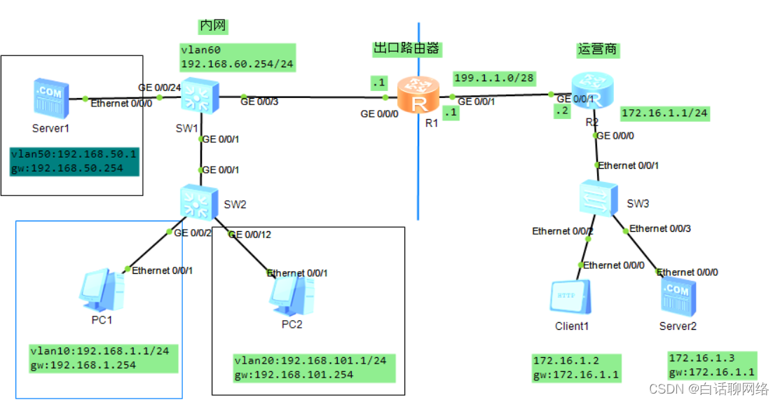 vlan、vlanif、ospf、静态、下放缺省路由、nat、nat映射