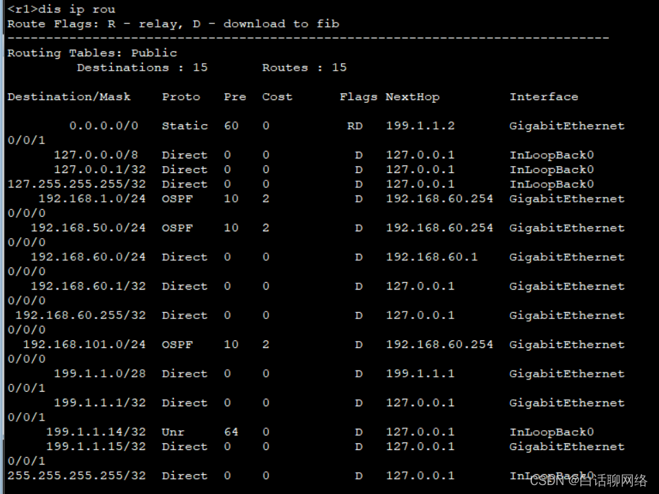 R1为边界设备,对外通过缺省路由出去,在外网口做nat地址转换,同时将缺省路由下放到ospf中,使得边界路由器下面的三层设备路由表中能学到0.0.0.0的缺省路由,如果不做下放缺省路由,边界一下的所有三层设备都需要手动写静态路由,配置量大