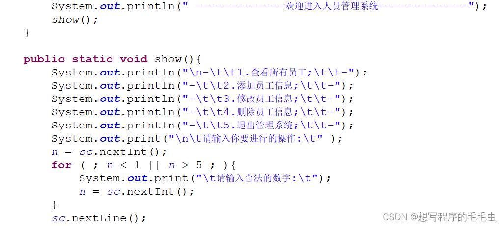 System.out.println("-\t\t2.添加员工信息;\t\t-");