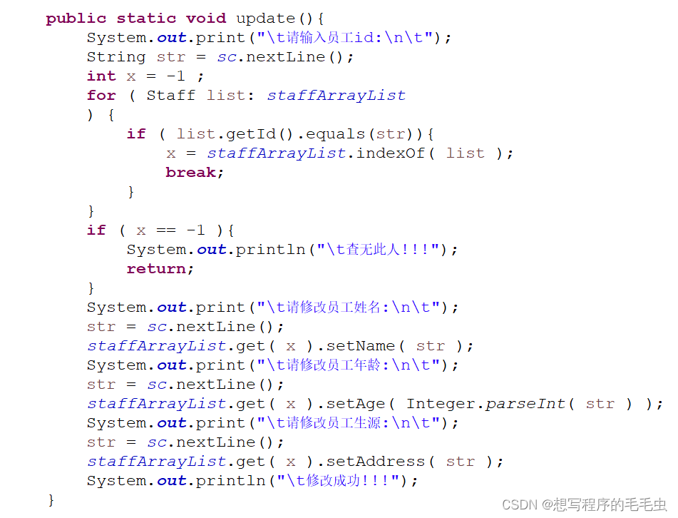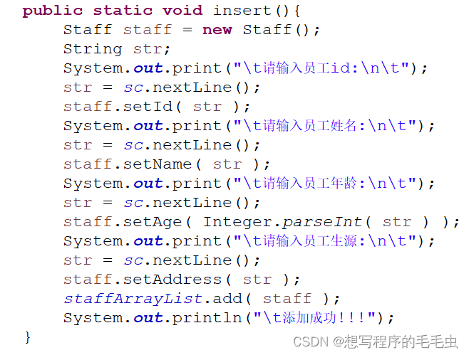 insert 方法先实例化一个 Staff 对象,并通过一个 str 字符串接收数据,将数据传入新对象,在添加每一项之前都输出一句提示信息,接收完数据后将对象增加进集合;