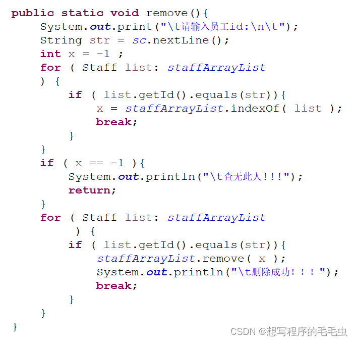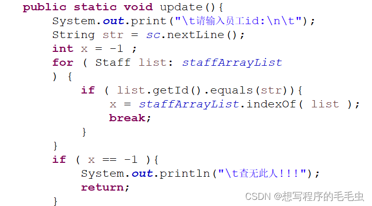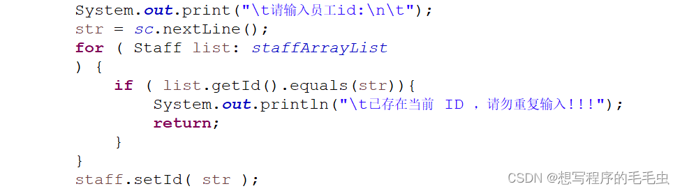 为保证 id 的唯一性,在输入员工 id 后使用 foreach 进行对集合的遍历判断,如果存在该 id 则输出提示信息并返回,反之则继续运行;