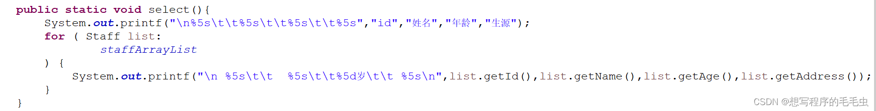 System.out.printf("\n %5s\t\t %5s\t\t%5d岁\t\t %5s\n",list.getId(),list.getName(),list.getAge(),list.getAddress());