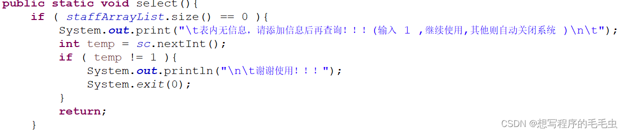 System.out.print("\t表内无信息,请添加信息后再查询!!!(输入 1 ,继续使用,其他则自动关闭系统 )\n\t");