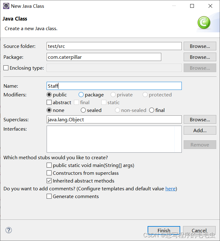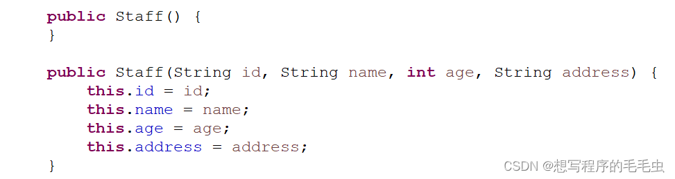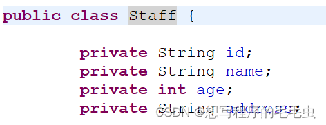 于 Staff 类中定义四个变量,分别存储人员的 id 、姓名 、年龄 、生源 ;