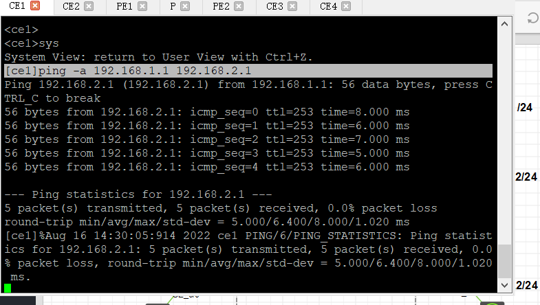 8,效果测试:在 CE 上使用 Loopback0 口为源地址 Ping 同公司对端私网业务网段,可以 Ping 通