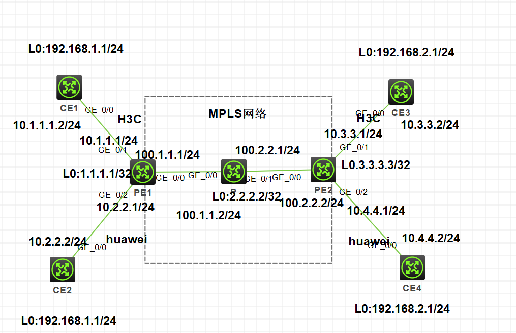 按照图示配置 IP 地址,h3c 公司和 huawei 公司连接同一个 PE 设备的私网 IP 网段存在地址复用,使用多 VRF 技术来防止 IP 冲突