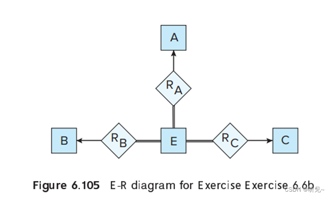 b. 请参见图6.105。其思想是引入 E 与关系 RA、RB、RC 之间的总参与约束,以便 E 中的每个元组都与 A、B 和 C 有关系。