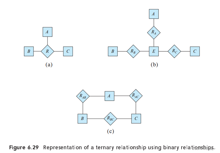 6.6 考虑使用图6.29b中所示的二元关系(不显示属性)来表示图6.29a的三元关系。