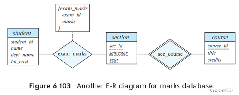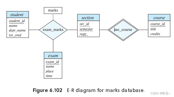 a. E-R图如图6.102所示。请注意,一种替代方法是将考试建模为与部分相关的弱实体,而不是作为强实体。成绩关系然后将是学生和考试之间的二元关系,而不直接涉及章节。