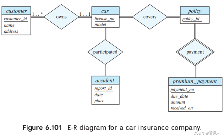 .1 构建一个汽车保险公司的E-R图,其客户拥有一个或多个汽车。每辆汽车与零个或多个记录的事故相关联。每份保险单涵盖一辆或多辆汽车,并与一个或多个与之关联的保险费支付相关联。每次付款都是针对特定的时间段,具有关联的到期日和付款收到日期。.