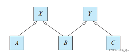 A继承X的所有属性,还可以定义自己的属性。类似地,C继承Y的所有属性以及自己的属性。B继承X和Y的所有属性。如果存在属于X和Y的某个属性名称,可以通过限定名称X.name或Y.name在B中引用它。.