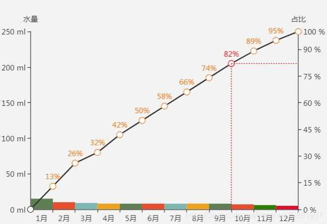app.title = '柏拉图'; option = { //标题 title:{ text: '柏拉图', left:'center' //居中显示 }, //添加横线滚动条(解决数据太多时显示重叠问题):根据实际是否需要显示,不显示注释 // dataZoom: { // start: 0, //默认为0 // end: 90 - 1500 / 31, //默认为100 // type: 'slider', // show: true, // xAxisIndex: [0,1],//需要缩放显示的横坐标的序号,多个用逗号分隔;[0,1]指分别缩放显示柱状图和折线图 // handleSize: 1, //滑动条的 左右2个滑动条的大小 // height: 15, //组件高度 // left: 20, //左边的距离 // right: 20, //右边的距离 // bottom: 20, //右边的距离 // fillerColor: new echarts.graphic.LinearGradient(1, 0, 0, 0, [{ // //给颜色设置渐变色 前面4个参数,给第一个设置1,第四个设置0 ,就是水平渐变 // //给第一个设置0,第四个设置1,就是垂直渐变 // offset: 0, // color: '#3FA7DC'//横向滚动条的颜色 // }, { // offset: 1, // color: '#eeeeee'//横向滚动条的颜色 // }]), // //backgroundColor: 'rgba(0, 0, 0, 0)', //两边未选中的滑动条区域的颜色 // showDataShadow: false, //是否显示数据阴影 默认auto // showDetail: false, //即拖拽时候是否显示详细数值信息 默认true // handleIcon: 'M-292,322.2c-3.2,0-6.4-0.6-9.3-1.9c-2.9-1.2-5.4-2.9-7.6-5.1s-3.9-4.8-5.1-7.6c-1.3-3-1.9-6.1-1.9-9.3c0-3.2,0.6-6.4,1.9-9.3c1.2-2.9,2.9-5.4,5.1-7.6s4.8-3.9,7.6-5.1c3-1.3,6.1-1.9,9.3-1.9c3.2,0,6.4,0.6,9.3,1.9c2.9,1.2,5.4,2.9,7.6,5.1s3.9,4.8,5.1,7.6c1.3,3,1.9,6.1,1.9,9.3c0,3.2-0.6,6.4-1.9,9.3c-1.2,2.9-2.9,5.4-5.1,7.6s-4.8,3.9-7.6,5.1C-285.6,321.5-288.8,322.2-292,322.2z', // filterMode: 'filter', // }, tooltip: { trigger: 'axis', axisPointer: { type: 'cross', crossStyle: { color: '#999' } } }, grid: { borderWidth: '10', borderColor : '#eeeeee' }, legend: { //selectedMode: false, //data:['水量','占比'] data:['',''] }, xAxis: [ { type: 'category', //显示横坐标中对应值的坐标线(竖线):默认不显示 //splitLine:{show:true}, data: ['1月','2月','3月','4月','5月','6月','7月','8月','9月','10月','11月','12月'] } ,{ type: 'category', show:false, boundaryGap : false, data: ['', '1月','2月','3月','4月','5月','6月','7月','8月','9月','10月','11月','12月'] } ], yAxis: [ { type: 'value', //纵坐标轴上的各个值对应的横线是否显示:默认显示 splitLine:false, name: '水量', min: 0, max: 250, interval: 50, axisLabel: { formatter: '{value} ml' } }, { type: 'value', name: '占比', min: 0, max: 100, interval: 15, //纵坐标轴上的各个值对应的横线是否显示:默认显示 splitLine:false, //splitArea : {show : true}, //保留网格区域 axisLabel: { formatter: '{value} %' } } ], series: [ { name:'水量', type:'bar', //柱状图之间的空隙为0 barCategoryGap: '0', //设置柱状图的颜色 itemStyle: { normal: { color: function(params) { var colorList = [ '#5e7e54','#e44f2f','#81b6b2','#eba422','#5e7e54', '#e44f2f','#81b6b2','#eba422','#5e7e54','#e44f2f','#2e7e04','#e00f2f' ]; return colorList[params.dataIndex] }, //color: '#5a9bd5', //设置柱状图边框线颜色 //barBorderColor: 'black', //设置柱状图边框线的显示宽度 //barBorderWidth:0.2 } }, data:[15, 10, 9, 8, 8, 8, 8, 8, 8, 7, 6, 5] }, { name:'占比', type:'line', symbolSize:10, //拐点显示设置(新版本EChart需要设置) symbol: function (value) { if (value > 0) {//值大于0才显示 return 'circle'; //拐点类型 } else { return 'none'; //拐点不显示 } }, //显示设置 itemStyle : { normal: { //color:'#f37b1d', color: function(params) { var colorList = [ '','#f37b1d','#f37b1d','#f37b1d','#f37b1d', '#f37b1d','#f37b1d','#f37b1d','#f37b1d', 'red','#f37b1d','#f37b1d','']; return colorList[params.dataIndex] }, label : { show: true, //格式化 formatter: '{c}%' } } }, xAxisIndex: 1, yAxisIndex: 1, data:[0, 13, 26, 32, 42, 50, 58, 66, 74, 82, 89,95, 100] } , { type: 'scatter', xAxisIndex: 1, yAxisIndex: 1, data: [[8, 82]], //symbolSize: 0, symbol:'none',//去掉箭头 //二八线 markLine: { itemStyle: { normal: { lineStyle: { color: "#c00", type: 'dotted', //'dotted'虚线 'solid'实线,默认实线 width: 1 }, label: { show: true, } }, //圆点加强显示 emphasis: { color: "#d9def7" } }, data: [ //指定坐标点之间的线 //竖线 [ { name: '', xAxis: '9月', yAxis: 82 }, { xAxis: '9月', yAxis: 0 } ], //横线 [ { name: '', xAxis: '9月', yAxis: 82 }, { xAxis: '12月', yAxis: 82 } ] ] ,symbol: ['none', 'none'], } } ] };
