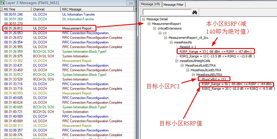 测量报告中报告了本小区RSRP值、RSRQ值以及目标小区PCI、目标小区RSRP值、目标小区RSRQ值。