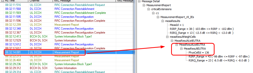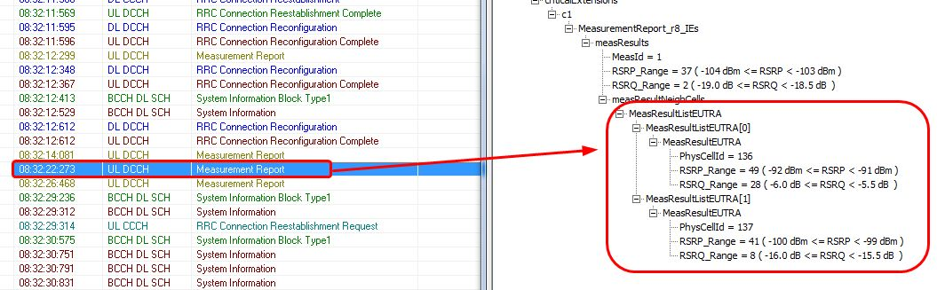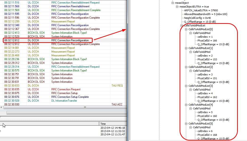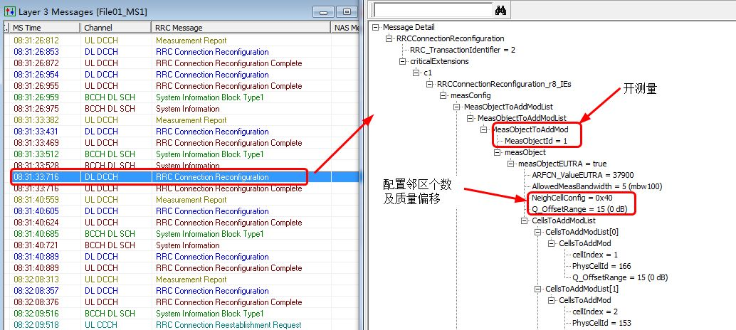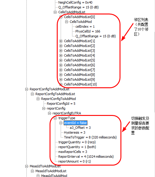 上图所示,RRC Connection Reconfiguration还包含邻区列表信息,包括所有邻区的小区编号Cell ID、PCI、Q_Offset等信息。