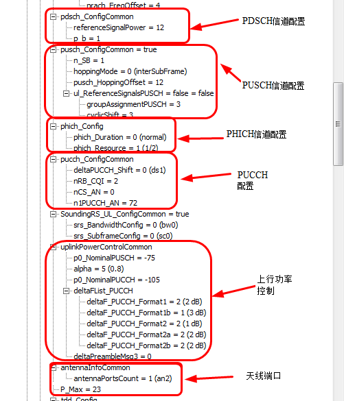 RRC Connection Reconfiguration还包含各个信道的配置信息,如PDSCH、PUSCH、PHICH、PUCCH、上行功率控制信息,以及小区通道数配置信息。