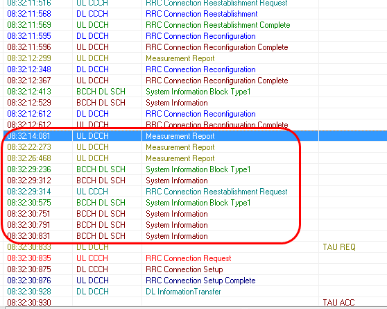 如上图,若发现信令中连续发现存在3次测量报告,且后续直接进行系统消息的读取,则可怀疑是存在邻区漏配的问题。