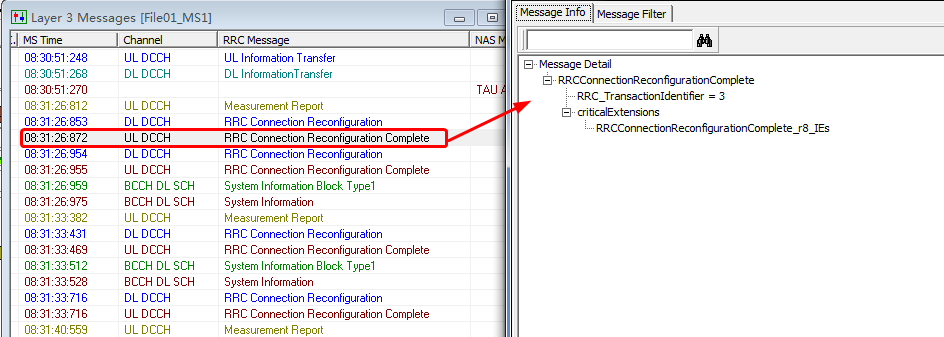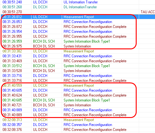典型的前台切换信令如下图所示,从测量报告上报到切换完成后直至读取目标小区的系统消息,与前台UE相关的总共有7条层三信令。