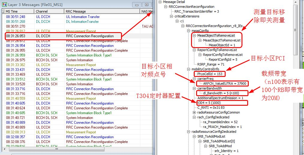 RRC Connection Reconfiguration信令首先提供给终端目标小区的频点、带宽、邻区配置数量和小区质量偏移。