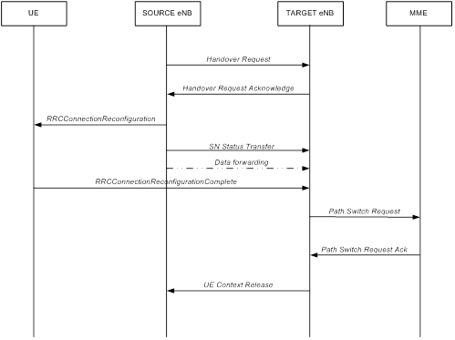 在UE上包测量报告后,源小区向目标小区发起“Handover Request”请求。目标小区收到请求后回应“Handover Request Acknowlege”,然后源小区向UE下发RRC连接重配置信息。