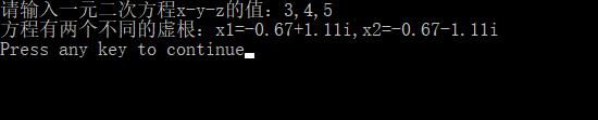 printf("方程有两个不同的虚根:x1=%.2lf+%.2lfi,x2=%.2lf-%.2lfi\n",x1,x2,x1,x2);