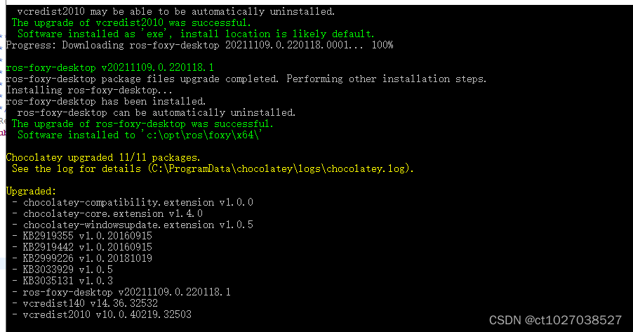 1.下载visual studio 2022 Community选择c++桌面应用。2.安装Chocolate工具1.点击命令工具2.复制下面指令,粘贴运行,自动下载安装Chocolate3.输入命令choco,显示chocolatey版本号,说明安装成功4.安装ROS2管理员身份进入powershell安装5.更新ROS2到新版本。
