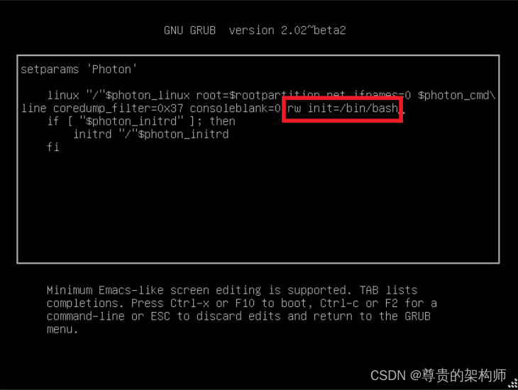 首先重启VCenter机器,然后开机猛按 e 键,进入GNU GRUB,在这里加一下红框内的文字,然后按下F10继续引导