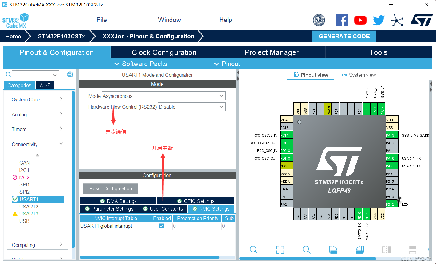 选择异步通信,开启中断,设置波特率为115200,数据传输长度8 bit,无奇偶校验位,停止位为1,使能接收与发送(usart1与usart3配置相同)。配置好后生成代码。