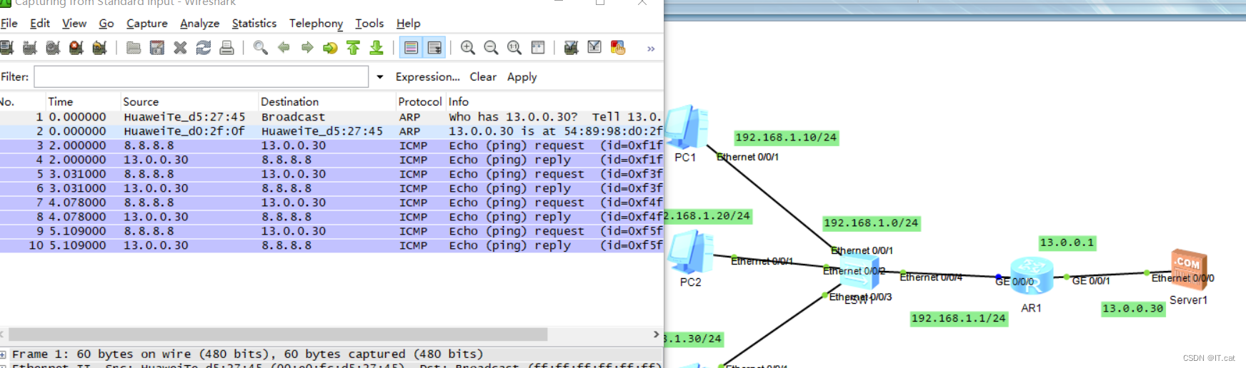 通过抓包可以看出,数据是通过映射的虚拟公网地址8.8.8.8出去的。