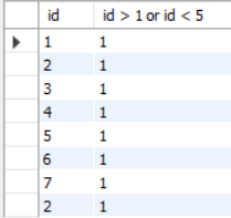 select id, id > 1 or id < 5 from exam_result;