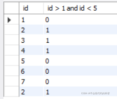 select id, id > 1 and id < 5 from exam_result;