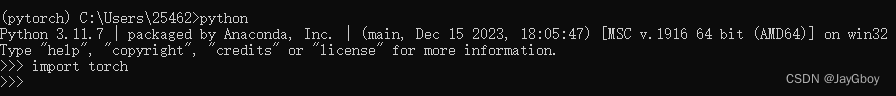 在pytorch环境下输入命令行python,然后输入import torch