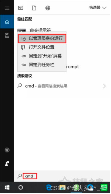 首先我们在开始菜单的搜索栏搜索“CMD”,找到命令提示符,我们鼠标右键点击“命令提示符”,弹出菜单之后选择“以管理员身份运行”,如下图所示。
