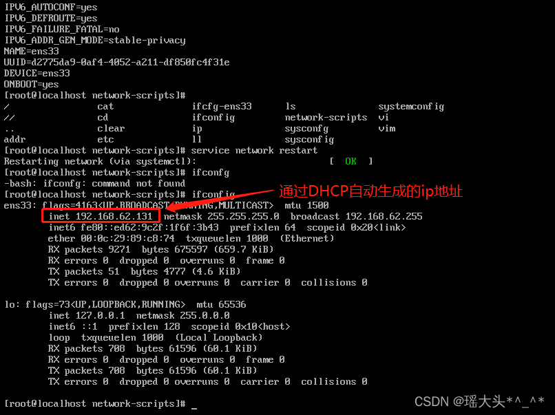 重启后再次使用ifconfig / ip addr 命令查看ip地址。
